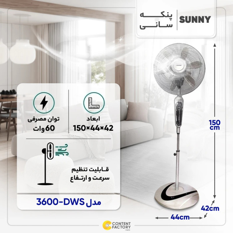 پنکه سانی مدل DWS-3600 محصولی ایستاده با قابلیت تغییر ارتفاع از طریق کوتاه و بلند کردن میلهی تلسکوپی آن است. این نوع پنکهی خانگی قابلیت تغییر سرعت در سه حالت و پنلی دیجیتال دارد و با وجود حجم باددهیای به اندازهی 100 متر مکعب بردقیقه، سرعت گردش پروانهها تا 1250 دور در دقیقه و ابعادی به اندازهی ۱۵۰x۴۲x۴۴.۵ سانتیمتر کالایی ایدئال برای خانههایی با متراژ زیر 100 متر است. پنکه سانی مدل DWS-3600 از ریموت کنترل و تایمر قابل تنظیم پشتیبانی میکند و با وجود بدنهای ایستا و مستحکم میتواند ثبات بالایی را در زمان کار بهویژه در حالت تند ایجاد کند. این کالا امکان چرخش عمودی و افقی به منظور گردش هوا به شکلی بهینهتر را دارد ولی متاسفانه در حالت تند و با حجم باددهی بالا امکان کار به شکل بیصدا را ندارد. این نوع پنکهی ایستاده هم همچون سایر محصولات مشابه به شکل غیر مونتاژ شده به مشتری عرضه میشود اما جای نگرانی نیست چرا که سر هم کردن آن بسیار ساده است.